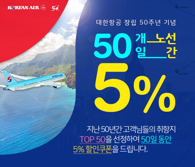 대한항공은 창립 50주년 기념 이벤트인 ‘50개 구간 50일간 5%'를 진행한다.