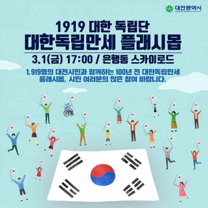 대전시는 오는 3월 1일 오후 5시 중구 으능정이거리에서 100년 전 3·1운동을 시민과 함께 재연하고 그 뜻을 기리는 플래시몹 ‘1919 대한독립만세’를 개최한다.