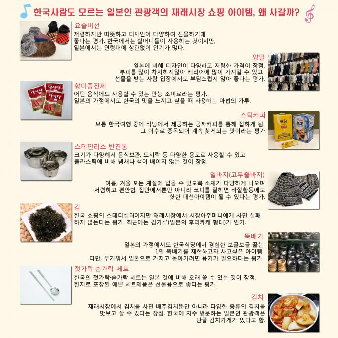 일본관광객이 한국 재래시장에서 가장 구입하고 싶은 품목으로 “요술버선”이 꼽혔다.