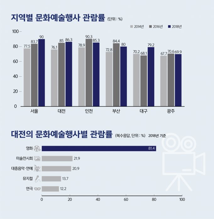 대전시의 문화예술행사 관람률이 전국 7개 특․광역시 가운데 두 번째로 높은 것으로 나타났다.지난 11일 문화체육관광부와 한국문화관광연구원이 발표한 ‘2018문화향수실태조사’ 결과에 따르면 대전의 문화예술행사 관람률은 86.3%로 7개 특․광역시 중 2위였다.