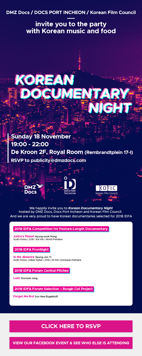 세계적인 다큐영화제로 손꼽히는 암스테르담 국제다큐멘터리영화제 (IDFA) (2018.11.14.~25) 기간 중에 열린 이날 행사에는 캐나다 핫독스(Hot Docs), 영국 셰필드(Sheffield Doc Fest) 다큐멘터리영화제 등 주요 다큐영화제의 프로그래머를 비롯해 국내외 감독...
