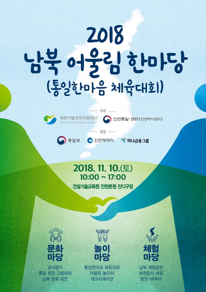 인천시(시장 박남춘)는 11월 10일(토) 오전 10시부터 남북하나재단과 인천 통일⁺센터(인천하나센터)가 공동 주최로 건설기술교육원 잔디구장에서 ‘2018 남북 어울림 한마당(통일한마음 체육대회)’ 행사를 개최한다고 밝혔다.