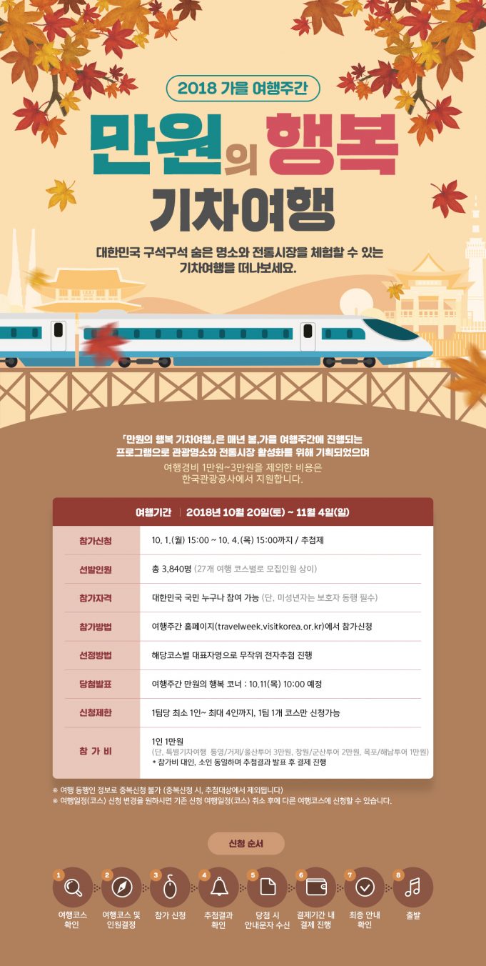 문화체육관광부(장관 도종환)와 한국관광공사(사장 안영배)는 가을여행주간(10월 20일~11월 4일)을 맞아 코레일과 협업해 진행하는 ‘만원의 행복’ 당일기차여행 참가 신청을 10월 1일 오후 3시부터 4일 오후 3시까지 접수한다고 밝혔다. 당첨자는 3,840명으로 추첨을 통해 선정한다.