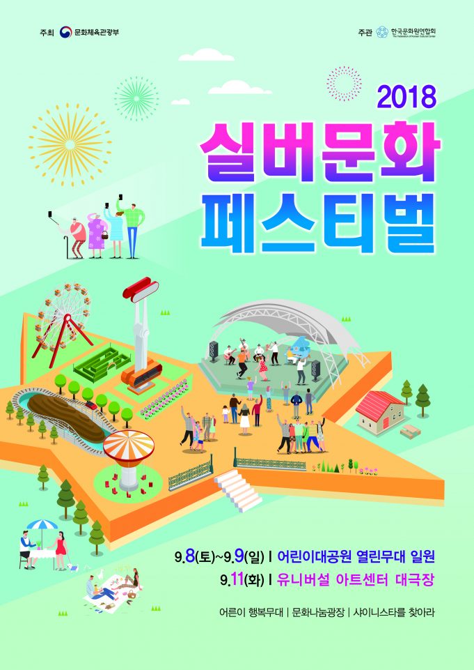 문화체육관광부(장관 도종환, 이하 문체부)가 주최하고 한국문화원연합회(회장 김태웅)가 주관하는 ‘2018 실버문화페스티벌’이 ▲9월 8~9일 어린이대공원과 ▲9월 11일 유니버설 아트센터에서 개최된다.