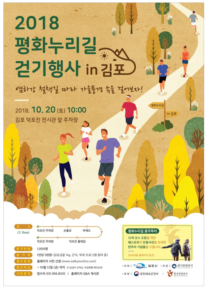 김포시와 경기관광공사는 ‘평화누리길 걷기행사 in김포’를 오는 10월 20일(일) 평화누리길 1코스 염하강 철책길 일원에서 개최한다고 밝혔다.