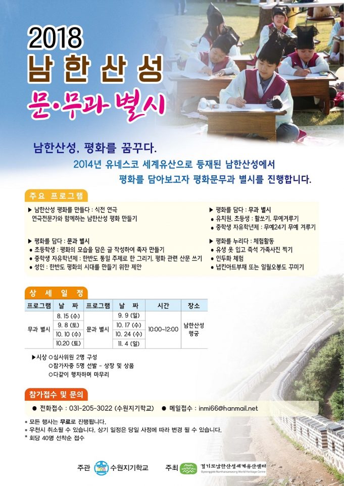 경기도남한산성세계유산센터는 오는 8월 15일 광복 73주년을 맞아 조선시대 과거시험을 재현하는 ‘남한산성 문무과 별시’ 행사를 개최한다고 밝혔다. 이날 오전 10시부터 남한산성 행궁 외행전에서 진행되는 ‘남한산성 문무과 별시’는 활쏘기와 무예 겨루기 등 무과시험으로 진행될 예정이다.