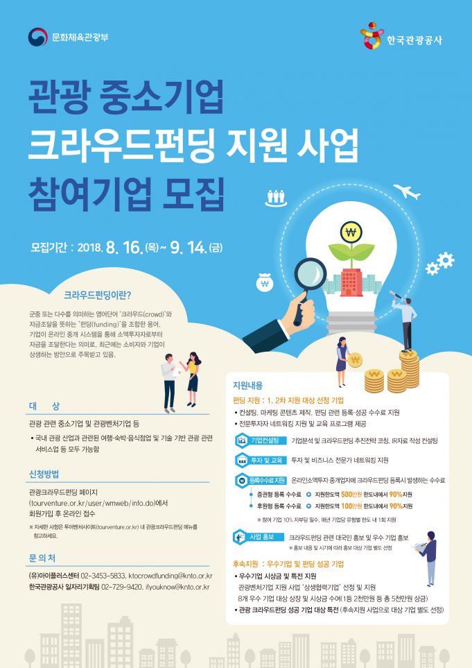 문화체육관광부와 한국관광공사는 8월 16일부터 9월 14일까지 ‘2018 관광 중소기업 크라우드펀딩 지원 사업’ 참가 기업 2차 공모를 실시한다고 밝혔다.