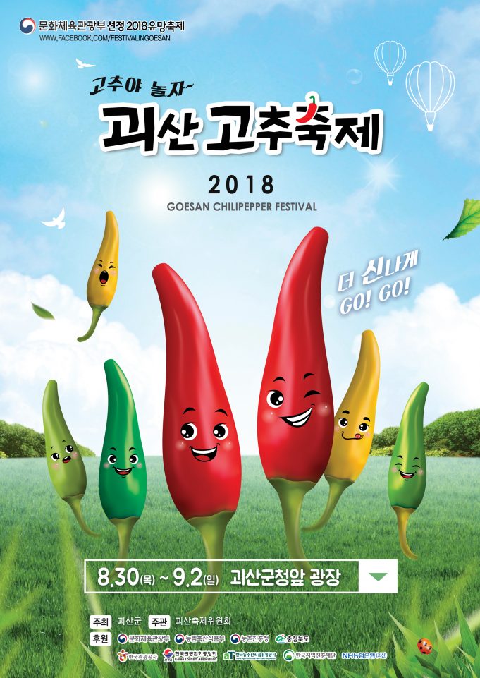 문화체육관광부 선정 유망축제인 ‘2018괴산고추축제’가 8월 30일부터 9월 2일까지 4일간 괴산군청 앞 광장 일원에서 개최된다.