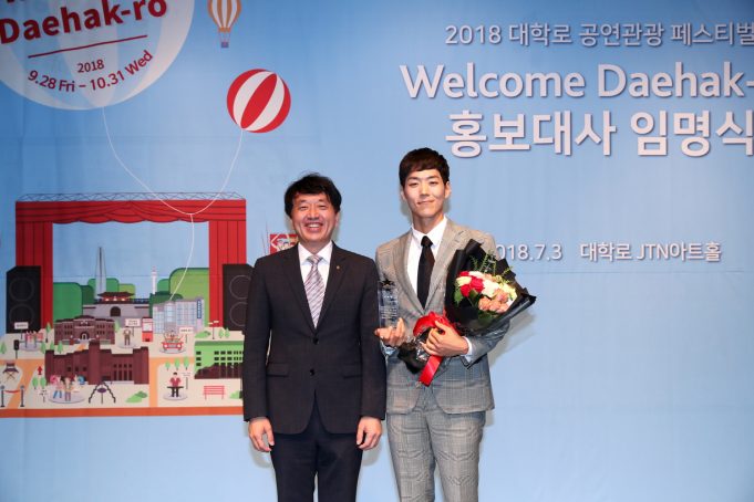 ▲한국관광공사 안영배 사장이 카이를 2018 대학로 공연관광 페스티벌 홍보대사로 위촉했다(사진=한국관광공사)
