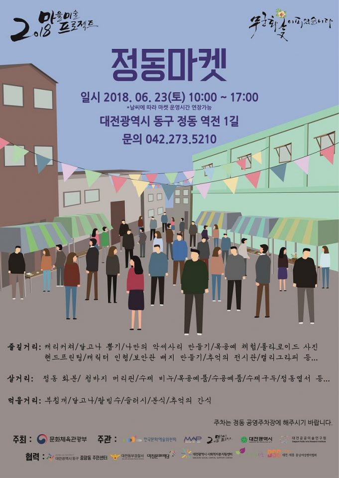 대전시는 오는 23일 오전 10시 동구 정동 역전길에서 마을미술프로젝트 ‘무궁화 꽃이 피었습니다’ 커뮤니티 사업인 ‘정동마켓’을 연다고 21일 밝혔다.