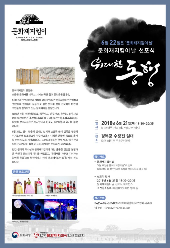 문화재청(청장 김종진)과 (사)한국문화재지킴이단체연합회(회장 조상열)는 21일 경복궁 수정전 일대에서 ‘문화재지킴이 날’(6월 22일)을 제정하고, 이를 기념하는 선포식을 개최한다고 밝혔다.