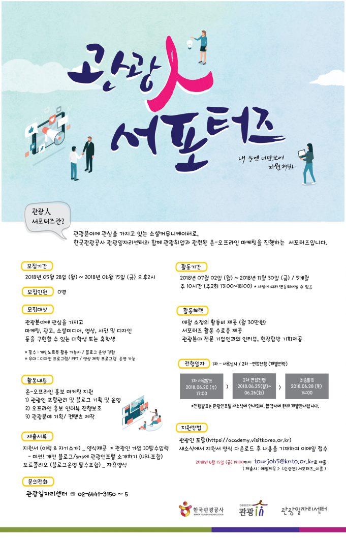 관광인 서포터즈에는 휴학생을 포함한 누구나 지원할 수 있다. 지원을 원하는 이는 5월 28일부터 6월 15일까지 관광공사가 운영하는 관광전문인력포털 ‘관광인(academy.visitkorea.or.kr)’에서 지원서를 작성한 후 이메일로 접수하면 된다.