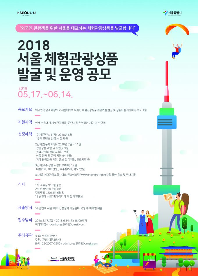공모 개요 ○ 공 모 명 : 2018년 서울 체험관광상품 발굴 및 운영 공모 ○ 주    최 : 서울특별시/서울관광재단 ○ 주    관 : ㈜피디엠코리아 ○ 접수기간 : 2018. 5. 18.(금) ~ 6. 14.(목) 18:00까지 ○ 신청대상 : 서울소재 체험 관광상품(콘텐츠)을 운영하고 있는...