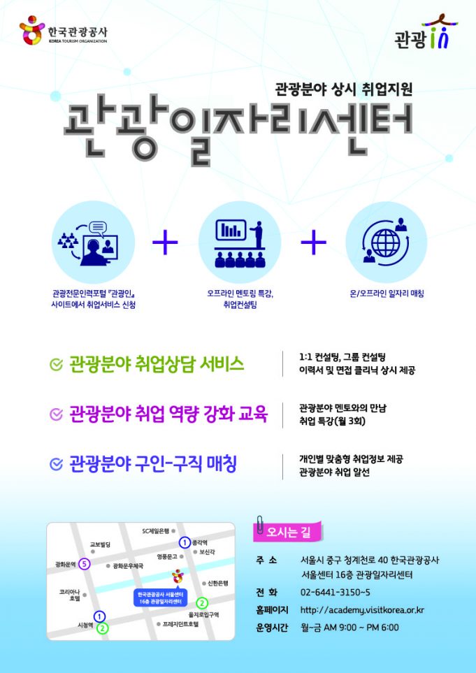 일자리센터는 관광공사가 운영하는 관광전문인력포털 ‘관광인(academy.visitkorea.or.kr)’을 기반으로 O2O(Online to Offline)...